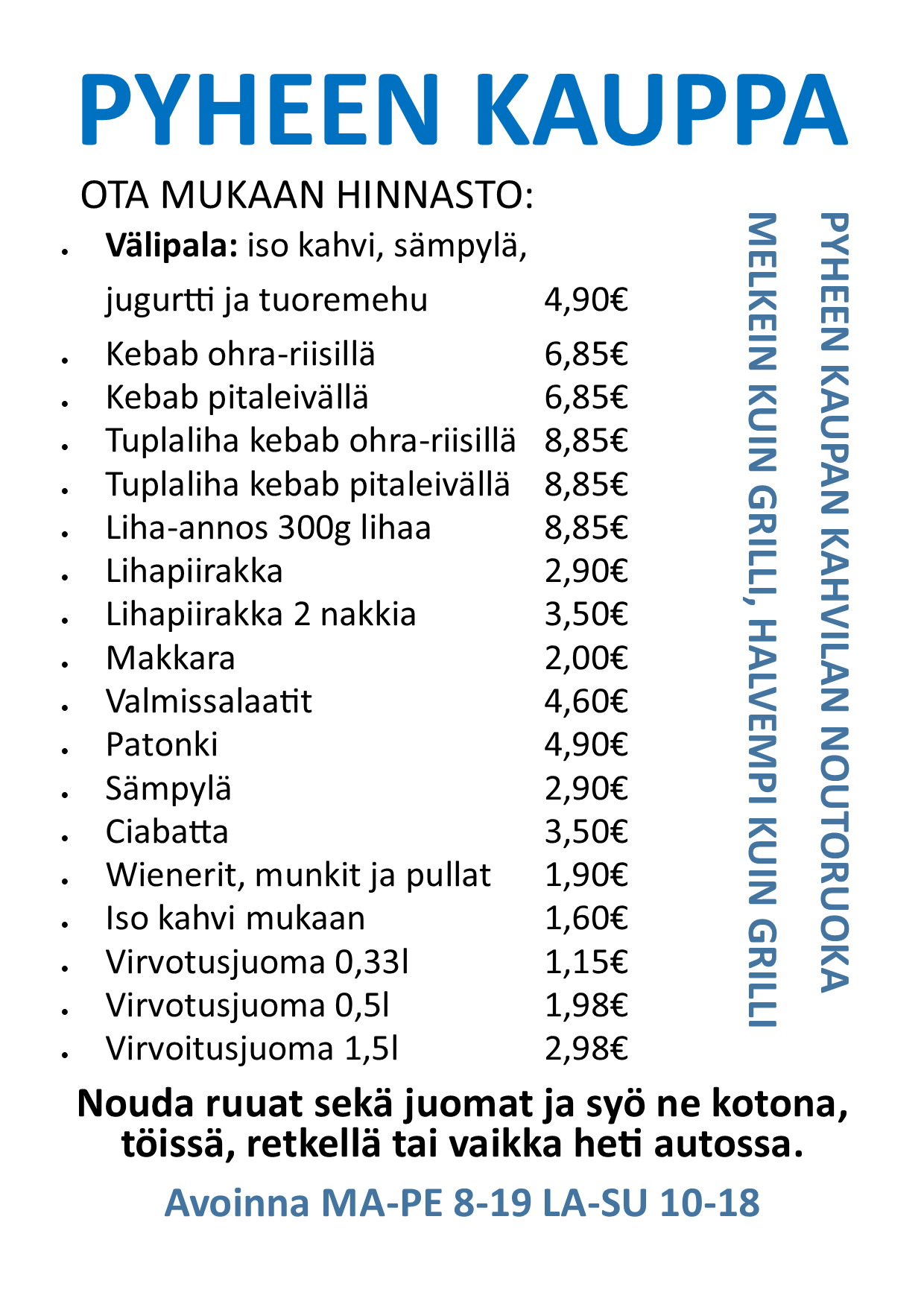 Nouda pikaruuat sekä juomat Pyheen kaupalta. Voit syödä ruuat kotona, töissä, retkellä tai vaikka heti autossa. Pyheen ruokakaupasta ja kahvilasta saat helposti mukaan kaikenlaiset ruuat ja eväät niin töihin, retkelle kuin kotiinkin.